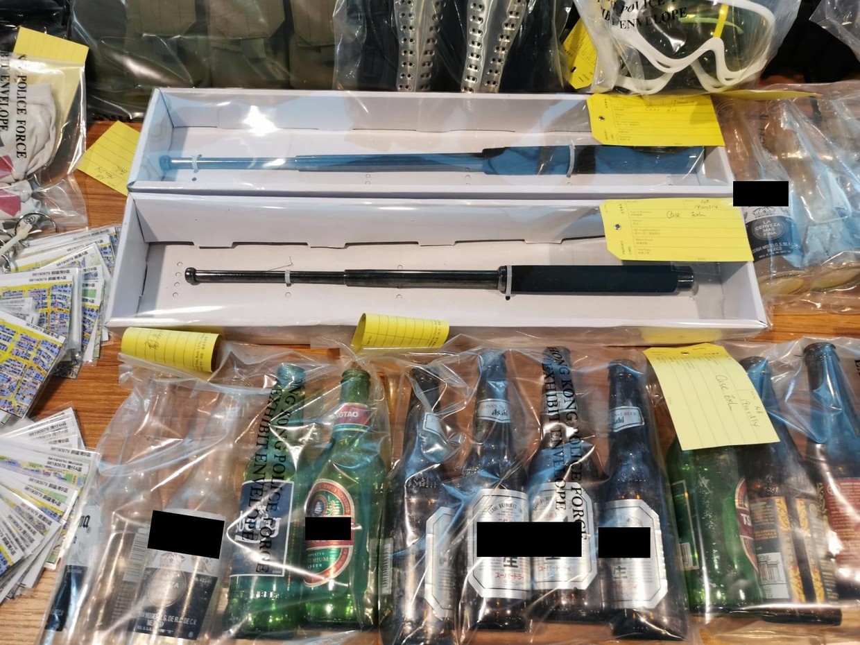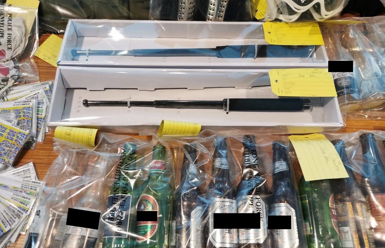 The authorities published photos of the items they discovered during the raid, which include several suits of body armor, various melee weapons as well as chemicals and glass bottles used in the manufacturing of petrol bombs – a weapon routinely deployed by the protesters to cause chaos in Hong Kong.
