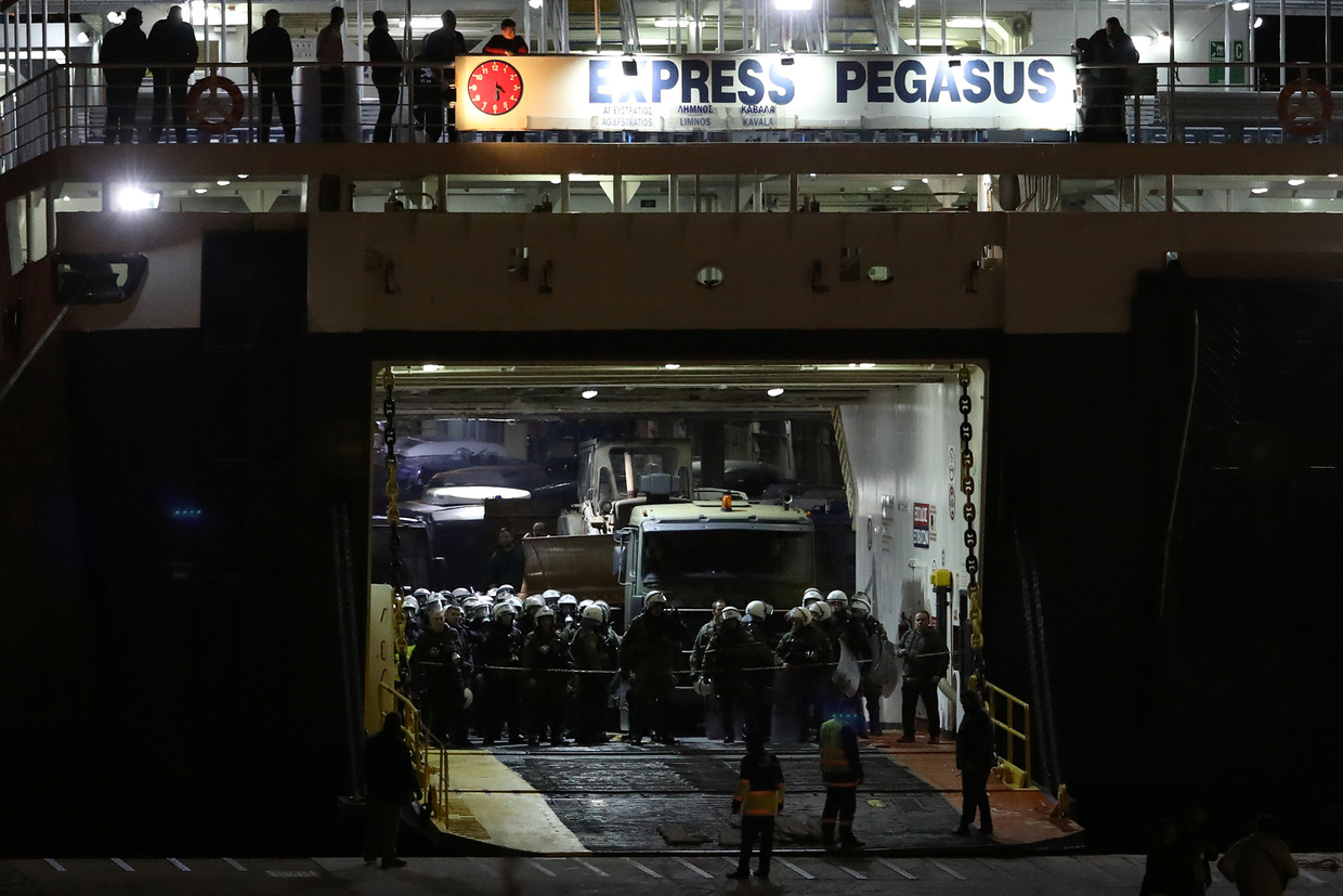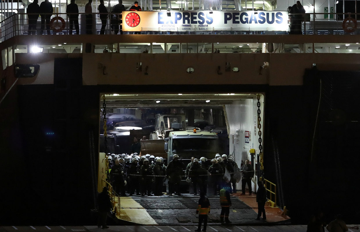 Riot police reinforcements arrive on a ferry at Lesbos, Greece, February 25, 2020.