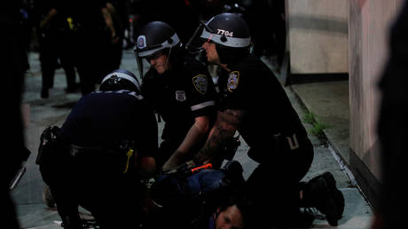 While the attorney said Gorski was accused of pushing an officer off his bike and breaking his hand, footage from Monday’s protest shows no such thing. Instead, Gorski – seen sporting an Eagles jersey and a ponytail – briefly tries to separate one officer from another protester, prompting police to rain down baton blows on the student, apparently striking him in the head and producing an audible thud. Gorski was then tackled, brought to the ground and arrested.
