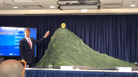 “I think the general shape is familiar to you, we went up the mountain, we curved the mountain, we came down the other side, and these are little telltale signs that to me represent what was going on,” Cuomo explained while unveiling the artwork. “From Day 1 to Day 111, it’s roughly scaled and then little visuals of what was going on.”