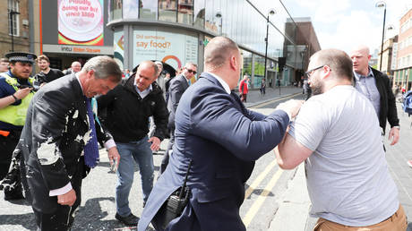 A man who threw a £5.25 Five Guys banana and salted caramel milkshake over Nigel Farage in Newcastle city centre has been whipped with a £350 fine to compensate for the Brexit Party leader’s splattered suit.