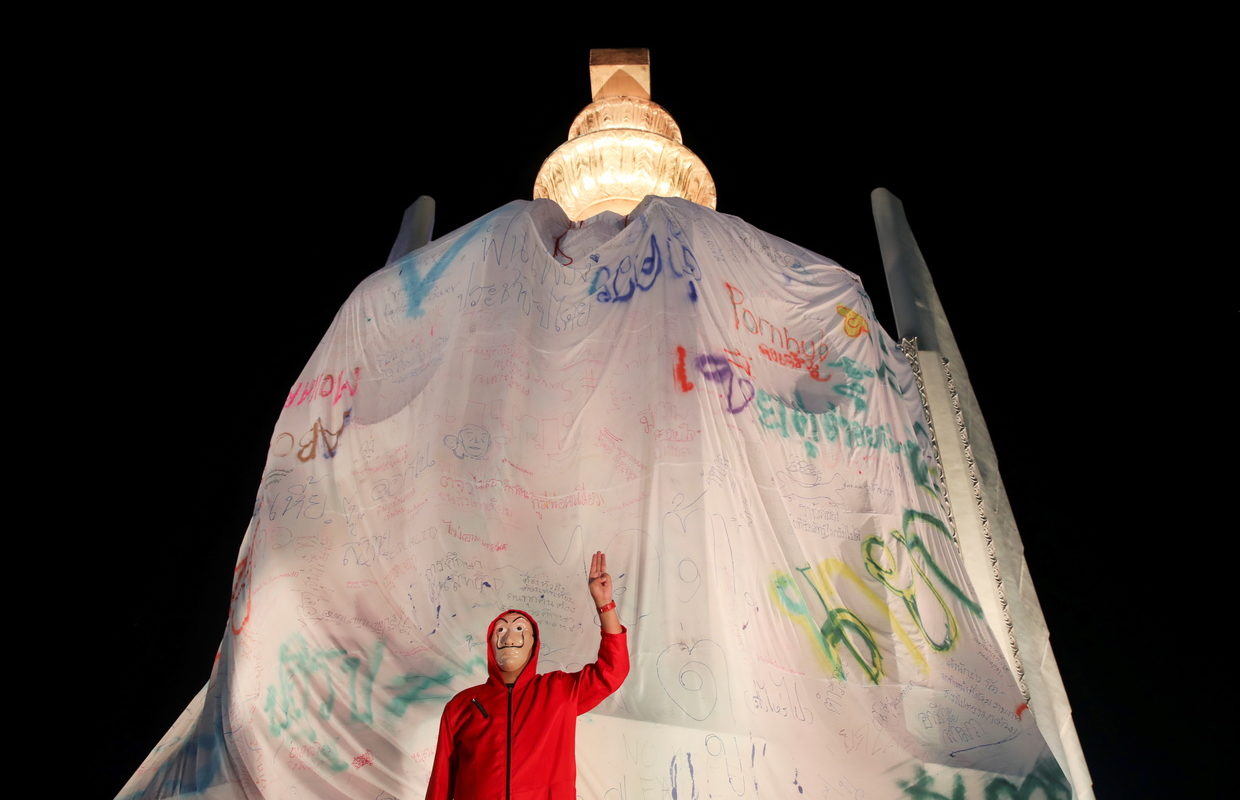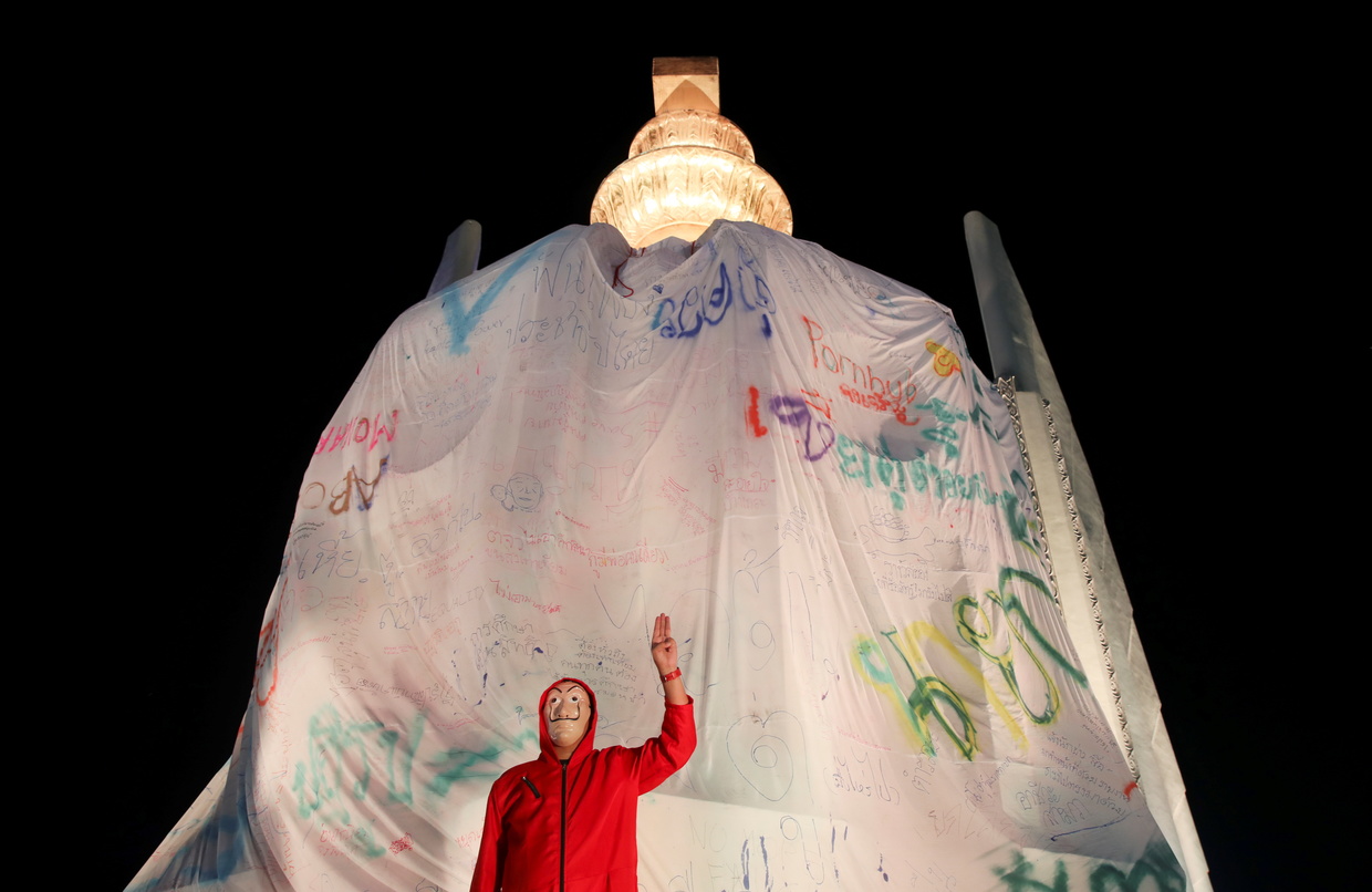Some 2,500 demonstrators, mostly youth, flocked to the Democracy Monument in the capital on Saturday. The activists used ladders to cover the three-meter-tall centerpiece of the monument with a massive white cloth, that featured various insults and slogans accusing the country’s rulers of stealing the people’s ‘bright future’ and assuring that ‘democracy will prevail.’
